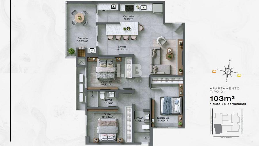1 suíte e 1 dormitório com 1 vaga de garagem.