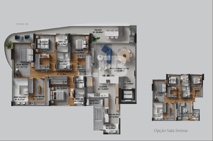 A distribuição privilegia fluidez, conforto acústico e integração entre ambientes — ideal para famílias que valorizam espaço verdadeiro e sofisticação atemporal.
