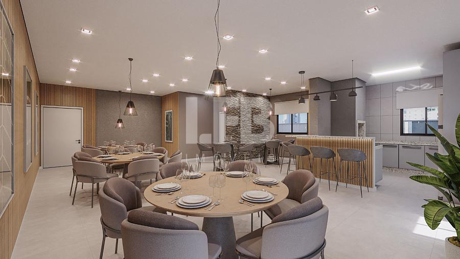 A área social possui sala de estar e jantar integradas, conectadas à sacada com churrasqueira a carvão, criando um ambiente perfeito para momentos de lazer e convivência.
