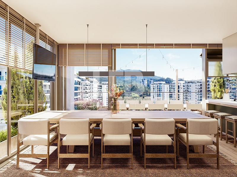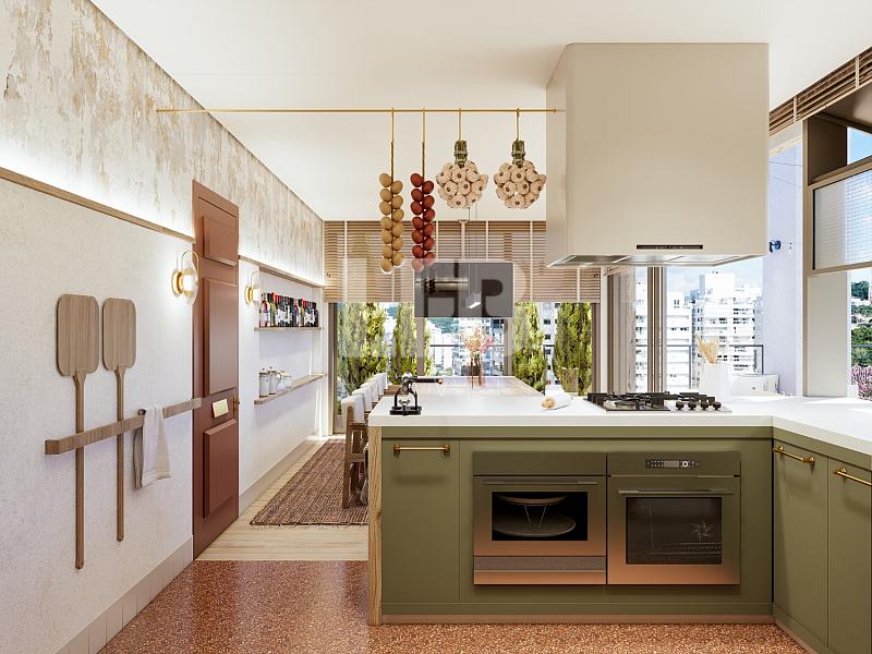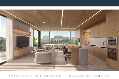 O apartamento conta com um living espaçoso e integrado, conectando sala de estar, jantar e cozinha, criando um ambiente moderno e ideal para convivência.