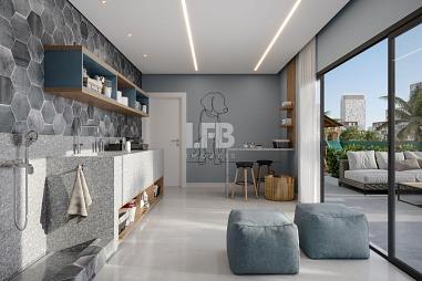 cozinha equipada com móveis planejados se integra à área de serviço, oferecendo praticidade e organização. A churrasqueira valoriza ainda mais o espaço social, ideal para momentos de lazer.