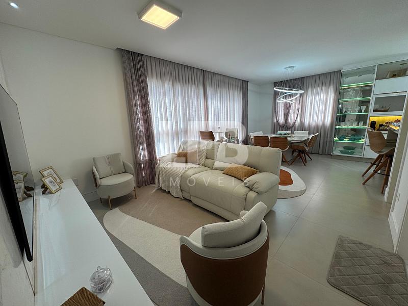 O living integrado conta com excelente aproveitamento de espaço, unindo sala de estar, jantar e cozinha em um ambiente moderno e acolhedor.