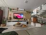 Living amplo e aberto com bastante iluminação e um confortável espaço na área de estar.