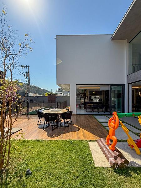 um amplo espaço gourmet integrado ao jardim gramado, com piscina aquecida e até uma charmosa casinha na árvore, criando um ambiente perfeito tanto para relaxar quanto para receber amigos e família.