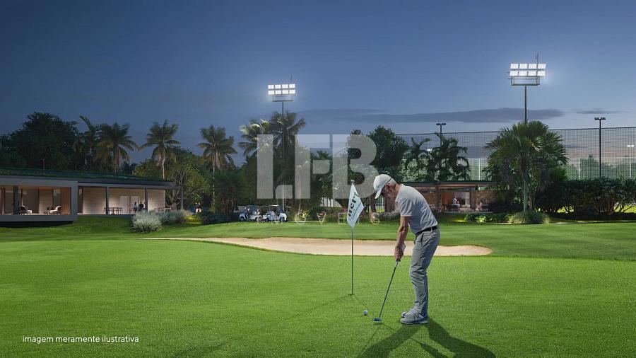 O projeto inclui um campo de golf com iluminação completa, permitindo jogo noturno e transformando o esporte em experiência social e de convivência, inovando o conceito tradicional de campos de golf residenciais.